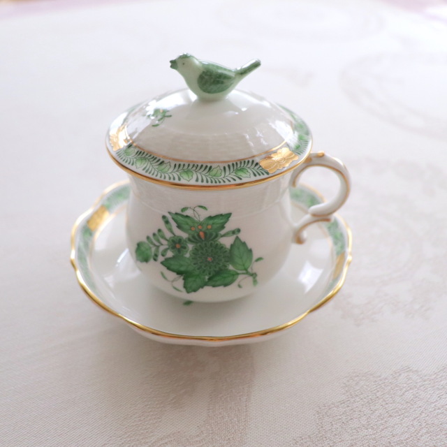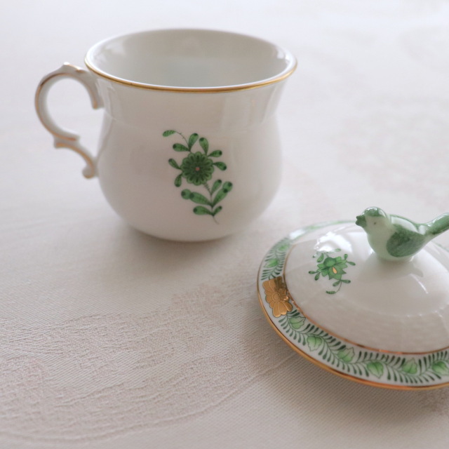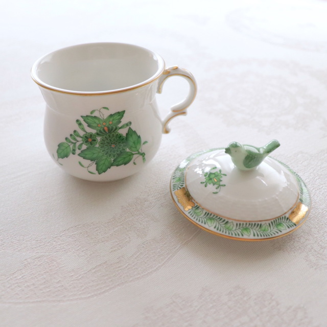 すっきりとしたグリーンが目を惹くアポニーグリーンにはちょっと面白い言い伝えがあります。 それは、1800年代後半の事。ハンガリーのアポニー伯爵という人がヘレンドに急遽パーティー用に新しいデザインのディナーセットが必要だと依頼したそうです。 急に言われても。。。と困ったヘレンドは、1867年パリの万国会に出品された「インドの華」をシンプルにしたデザインを提案しました。その後、アポニーグリーンは世界的に最も愛されるヘレンドの食器の一種となります。 ****************************************** 今回ご案内させていただく商品は持ち手がコロンっと可愛らしいクリームカップ。 通常のクリームカップの容量が満水時約120mlに比べ、こちらのラージサイズは容量が160mlもあります。 ハンドルもしっかり指を通せるのに、エレガントなデザインなのも特徴的な商品です。 お蓋の小鳥は鶯のようで、和洋中、どんなシーンでも活躍してくれます。 可愛らしい表情もお楽しみいただきたいポイントの1つです。 是非、ご検討くださいませ。 *アポニーグリーンの作品はデザインの特性上1点1点サブモチーフ(カップの背面のがら)が異なります。 写真とは異なるサブモチーフの商品が届く可能性がございますこと、ご留意ください。 (*商品のサイズ:横約90mm / 高さ約95mm) ****************************************** *こちらの商品は一部金彩にムラが見られる事があります。これはハンドメイドの製造過程中に生じるものであり、不良品ではございません。当店の商品はメーカー側の検品と合わせ、3度の検品が行われております。又、ハンドペイントの為、1点1点多少風合いの異なりやお色の濃淡が出ます。ハンドメイドの良さとしてご理解頂いた上でお求め下さいますようお願い申し上げます。