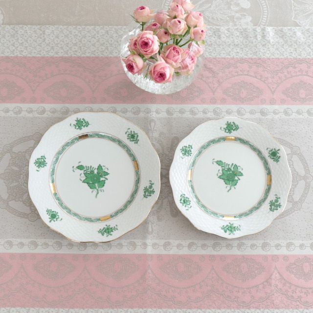 すっきりとしたグリーンが目を惹くアポニーグリーンにはちょっと面白い言い伝えがあります。 それは、1800年代後半の事。ハンガリーのアポニー伯爵という人がヘレンドに急遽パーティー用に新しいデザインのディナーセットが必要だと依頼したそうです。 急に言われても。。。と困ったヘレンドは、1867年パリの万国会に出品された「インドの華」をシンプルにしたデザインを提案しました。その後、アポニーグリーンは世界的に最も愛されるヘレンドの食器の一種となります。 ****************************************** 「スタンダードなプレート。」 どのお店でも見かける定番中の定番、19cmのプレートです。 敢えて当店でご案内する必要はないかな・・・と思っておりましたが、意外とお問い合わせをいただきますので、初のご案内をいたします。 ヘレンド定番の使い勝手の良さをお楽しみください。 (*商品のサイズ: 直径190mm、高さ20mm) ****************************************** *こちらの商品は一部金彩にムラが見られる事があります。これはハンドメイドの製造過程中に生じるものであり、不良品ではございません。当店の商品はメーカー側の検品と合わせ、3度の検品が行われております。又、ハンドペイントの為、1点1点多少風合いの異なりやお色の濃淡が出ます。ハンドメイドの良さとしてご理解頂いた上でお求め下さいますようお願い申し上げます。