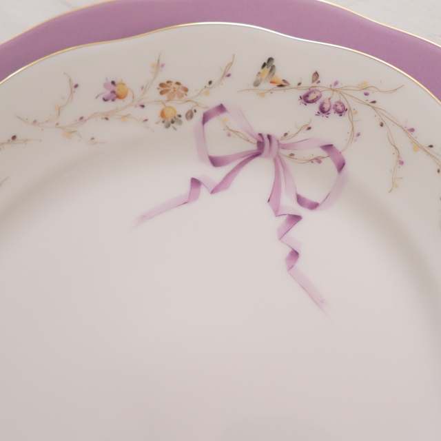 こちらはエデンシリーズのシンプルバージョン。 エデンのゆらりと優雅なリボンが引き立ち、周りの繊細な蔦が落ち着いたイメージです。 落ち着いた藤色が印象的なこちらの作品。 ヘレンド独特の手描きの良さがシンプルながらも、お色と絵柄両方でお楽しみ頂けるかと存じます。又、フルデザインと比べてお手に取って頂きやすいお値段も魅力です。 今回ご案内致します商品は定番のデザートプレート 。 シンプルなのに優雅で大人可愛いこちらの商品。とてもオススメの1品です。 シンプルシリーズのコーディネートは実に様々。 フルデザインのカップ&ソーサーにシンプルデザインのプレートを合わせても更にお互いが引き立ちます。逆に、シンプルデザインのカップ&ソーサーにフルデザインのプレートを合わせても素敵です。 シンプル同士を合わせても、、、色々な組み合わせで異なった雰囲気をお楽しみ頂けます。 是非、エデンシリーズの足し引きの面白さをご体験下さい。 パープル塗りが美しいシルクリボンのアンダープレートはこちらから (*商品のサイズ:直径 190mm/ 高さ 20mm)