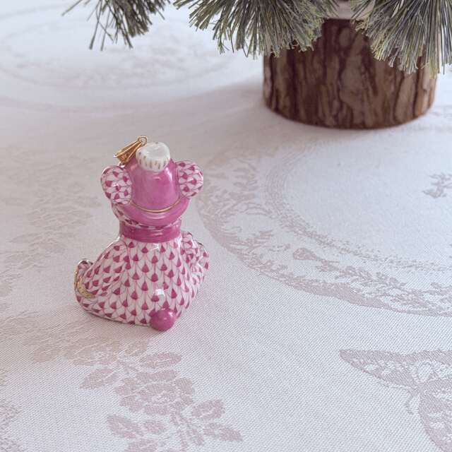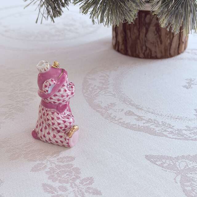 冬支度のくまさん・クリスマスオーナメント ヘレンドを象徴する「フィッシュネット」模様に、マフラーとお帽子で冬支度をした愛らしいくまさんが登場しました。 「フィッシュネット」は、フランス語で“鱗”を意味する「Écaille(エカイユ)」とも呼ばれています。 その起源は、東洋の七宝文様がヨーロッパへ伝わる過程で独自の変化を遂げ、ヘレンドの絵付師たちの手によって、繊細で優美な筆致へと昇華されたものといわれています。 また、「魚の鱗」は古来より“繁栄”を象徴する吉祥文様。 クリスマスという祝福の季節にふさわしい、幸運を呼び込むモチーフでもあります。 一筆一筆、息をのむほど緻密に描かれたフィッシュネット模様は、まさにヘレンドのペインターたちの卓越した技術の結晶。 眺めるたびに心が満たされる、優美で可憐な存在感を放ちます。 飾り台に置いてお楽しみいただくのはもちろん、お帽子の金具にリボンを通してツリーに飾っても、とびきりキュート。 あたたかな灯りを受けて金彩がいっそう輝き、ツリーの中でひときわ華やかに映えることでしょう。 サイズ: 高さ 約6.5cm/幅 約4.5cm / 奥行 約3cm